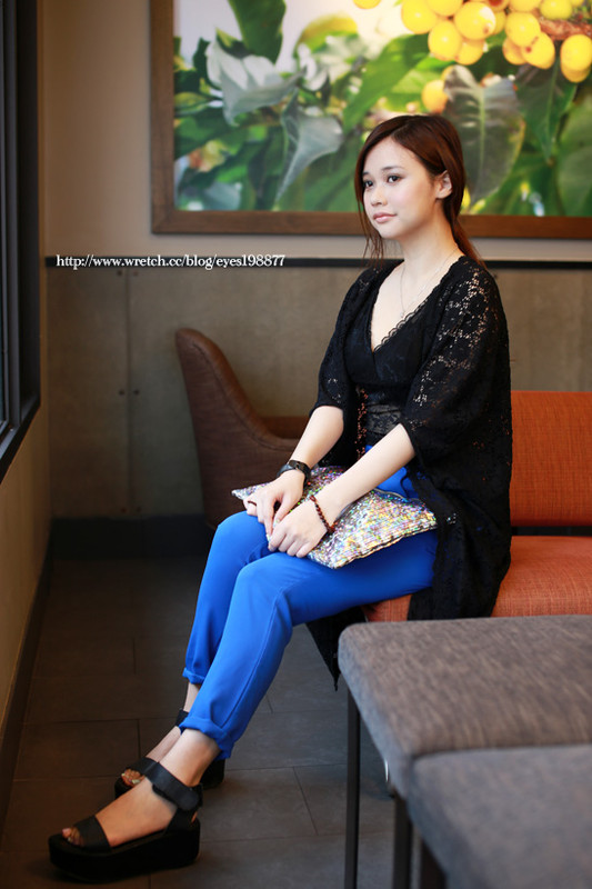 搭配寶藍色的哈倫褲,整個顏色都亮了起來,